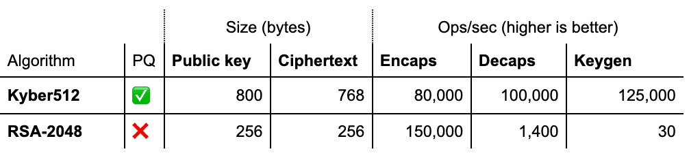 ML-KEM-768 (Kyber) | KEM | 1,184 | 1,088 | AES-192 | Faster decapsulation than RSA; ~80k ops/sec encapsulation |